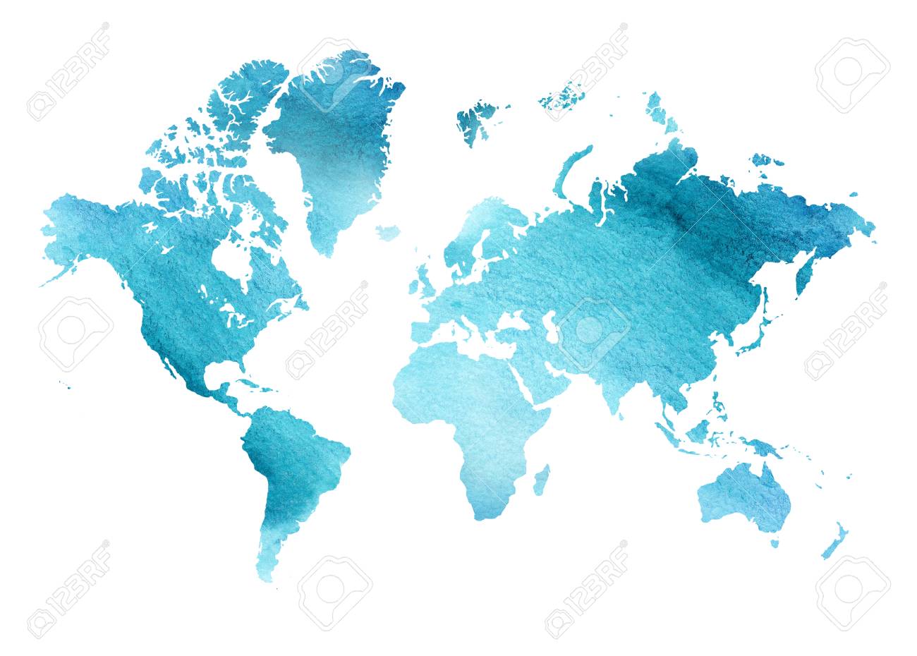 Illustrated Blue Watercolor Map Of The World With A Isolated