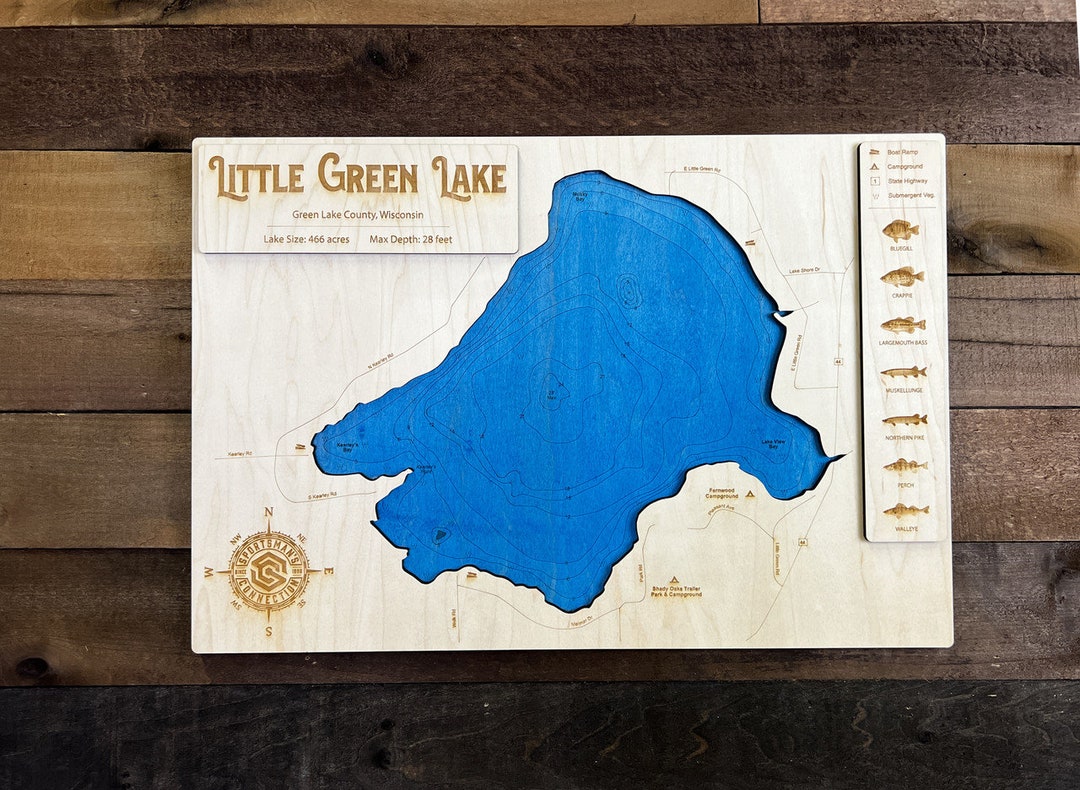 Little Green Lake green Lake Co, WI Wooden Engraved Map, Wall Art